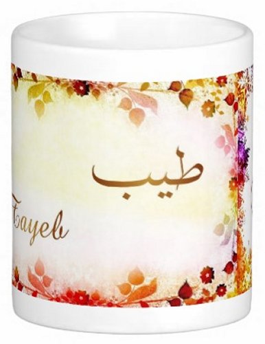 Mug avec le prénom "Tayeb" écrit en français, en arabe (طيب) et calligraphié de façon artistique en arabe sur la partie droite.
