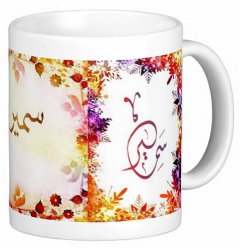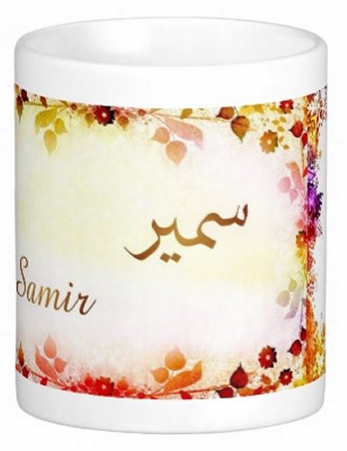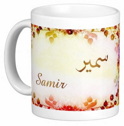 Mug avec le prénom "Samir" écrit en français, en arabe (سمير) et calligraphié de façon artistique en arabe sur la partie droite.