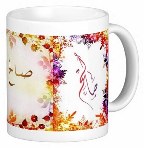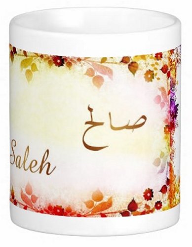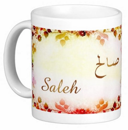 Mug avec le prénom "Saleh" écrit en français, en arabe (صالح) et calligraphié de façon artistique en arabe sur la partie droite.