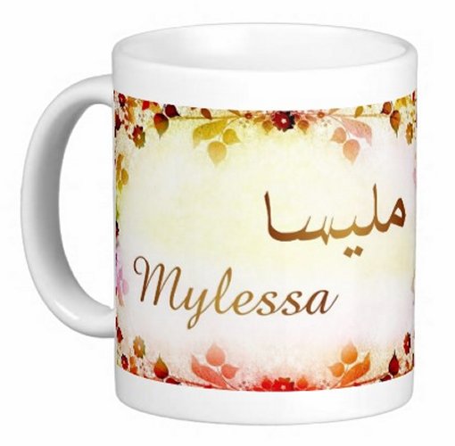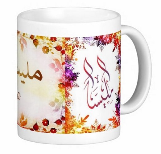 Mug avec le prénom "Melyssa" écrit en français, en arabe (مليسا) et calligraphié de façon artistique en arabe sur la partie droite.