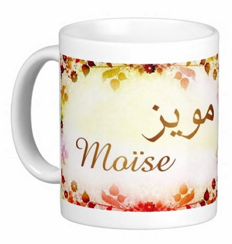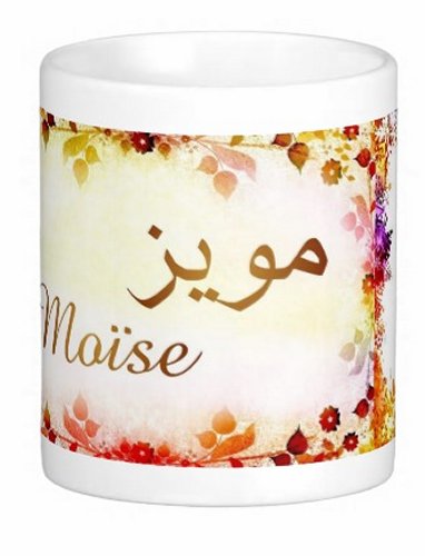 Mug avec le prénom "Moïse" écrit en français, en arabe (مويز) et calligraphié de façon artistique en arabe sur la partie droite.