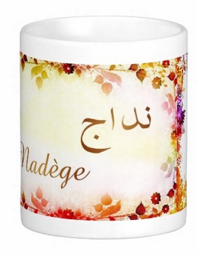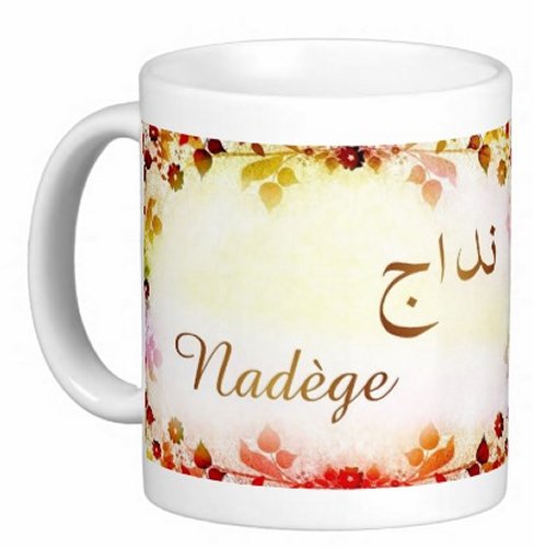 Mug avec le prénom "Nadège" écrit en français, en arabe (نداج) et calligraphié de façon artistique en arabe sur la partie droite.