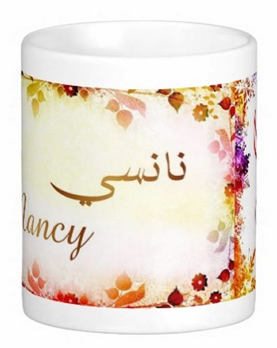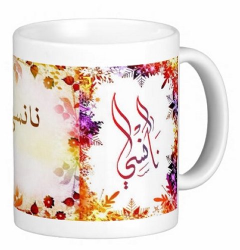 Mug avec le prénom "Nancy" écrit en français, en arabe (نانسي) et calligraphié de façon artistique en arabe sur la partie droite.