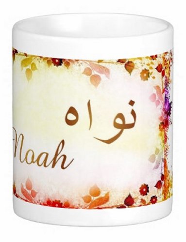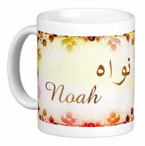 Mug avec le prénom "Noah" écrit en français, en arabe (نواه) et calligraphié de façon artistique en arabe sur la partie droite.