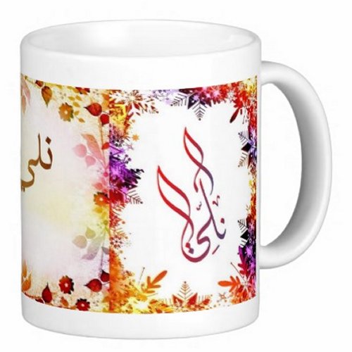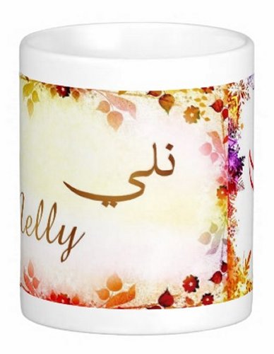 Mug avec le prénom "Nelly" écrit en français, en arabe (نلي) et calligraphié de façon artistique en arabe sur la partie droite.