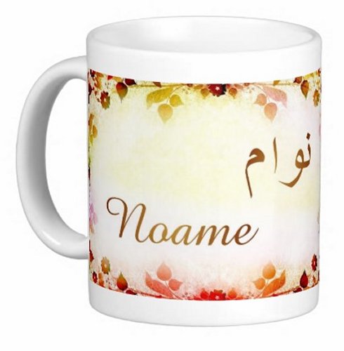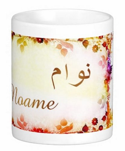 Mug avec le prénom "Noame" écrit en français, en arabe (نوام) et calligraphié de façon artistique en arabe sur la partie droite.