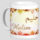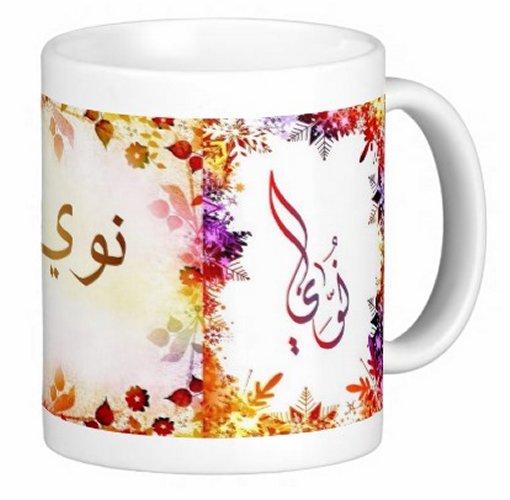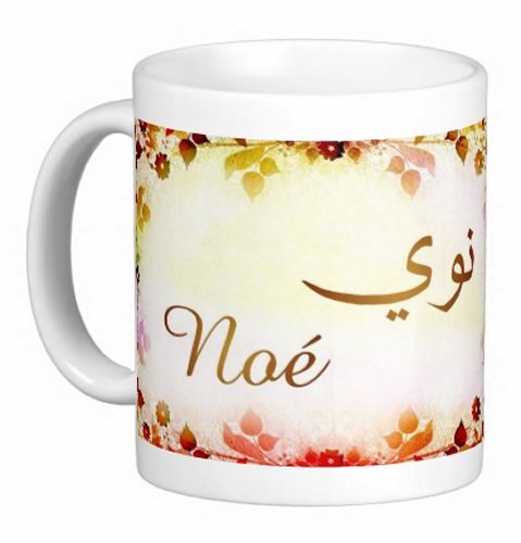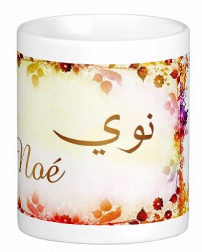 Mug avec le prénom "Noè" écrit en français, en arabe (نوي) et calligraphié de façon artistique en arabe sur la partie droite.