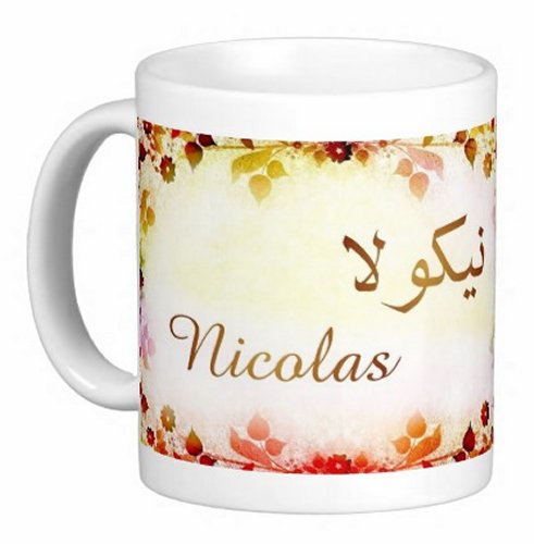 Mug avec le prénom "Nicolas" écrit en français, en arabe (نيكولا) et calligraphié de façon artistique en arabe sur la partie droite.