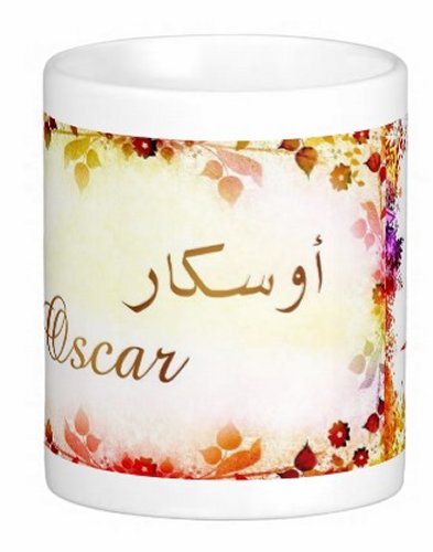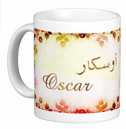 Mug avec le prénom "Oscar" écrit en français, en arabe (أوسكار) et calligraphié de façon artistique en arabe sur la partie droite.