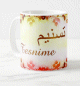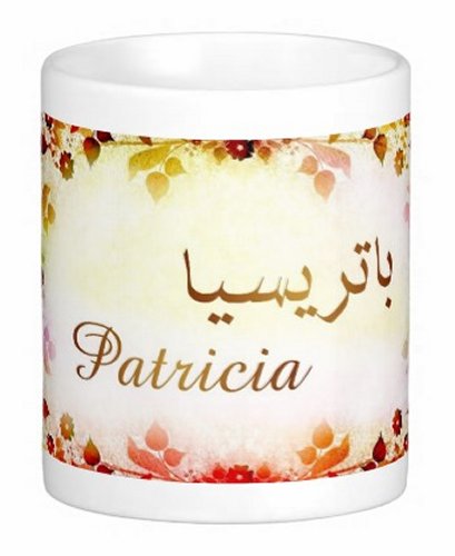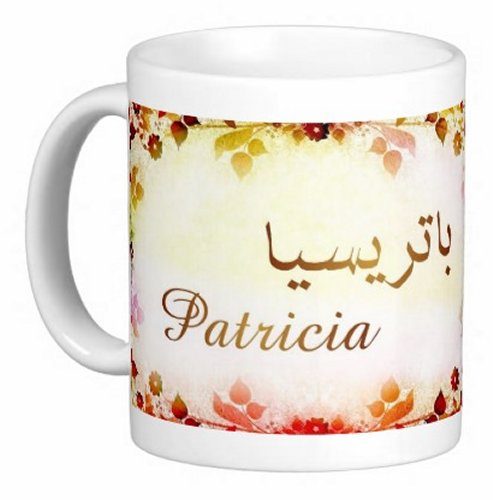 Mug avec le prénom "Patricia" écrit en français, en arabe (باتريسيا) et calligraphié de façon artistique en arabe sur la partie droite.