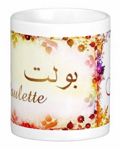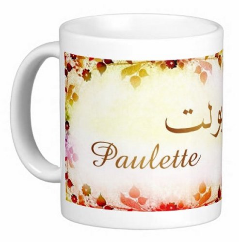 Mug avec le prénom "Paulette" écrit en français, en arabe (بولت) et calligraphié de façon artistique en arabe sur la partie droite.