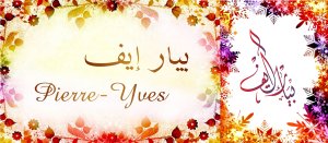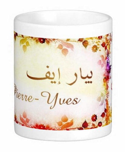 Mug avec le prénom "Pierre-Yves" écrit en français, en arabe (بيارإيف) et calligraphié de façon artistique en arabe sur la partie droite.