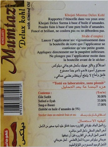 Khol en poudre de qualité supérieure de la marque Khojati Mumtaz. Rapportez l'étincelle dans vos yeux avec Khojati deluxe Surma à base d'huile d'amandes. Poudre faite à base d'une pure huile d'amandes. Foncé et brillant, ne coulera pas et ne débordera pas.