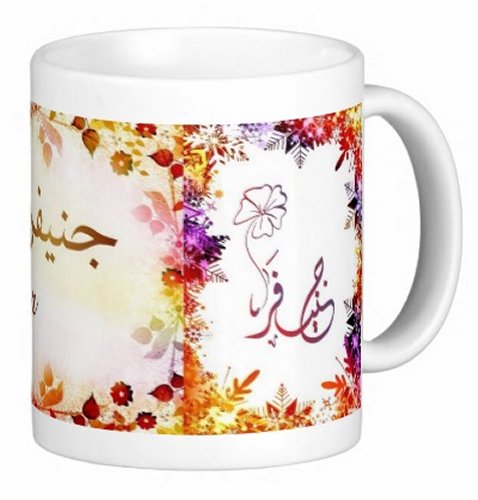 Mug avec le prénom "Jennifer" écrit en français, en arabe (جنيفر) et calligraphié de façon artistique en arabe sur la partie droite.
