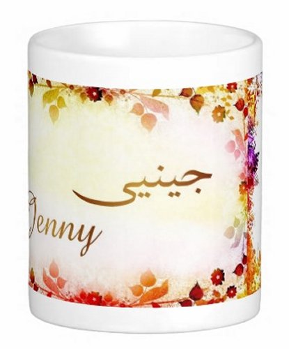 Mug avec le prénom "Jenny" écrit en français, en arabe (جيني) et calligraphié de façon artistique en arabe sur la partie droite.