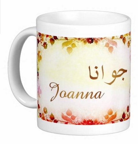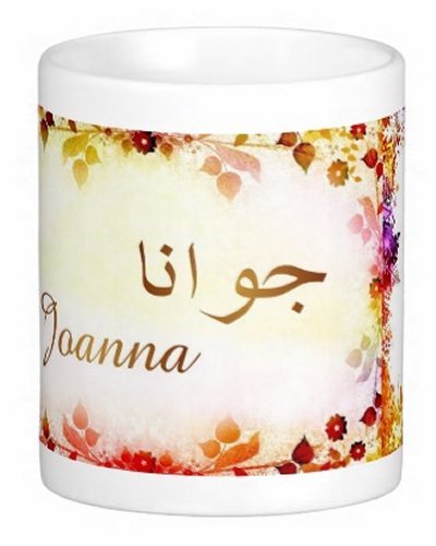 Mug avec le prénom "Joanna" écrit en français, en arabe (جوانا) et calligraphié de façon artistique en arabe sur la partie droite.