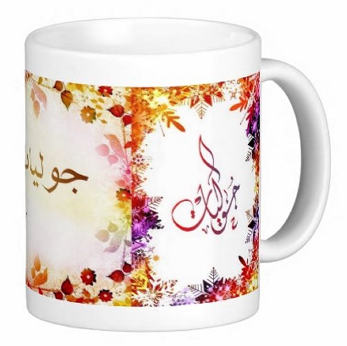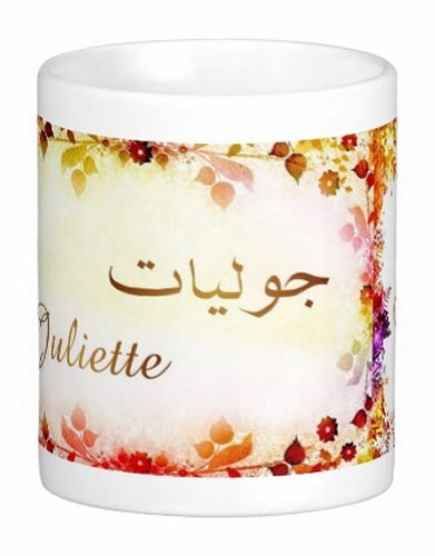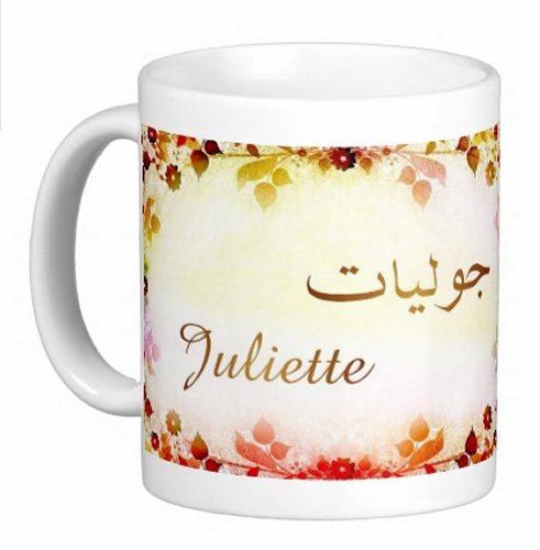 Mug avec le prénom "Juliette" écrit en français, en arabe (جوليات) et calligraphié de façon artistique en arabe sur la partie droite.