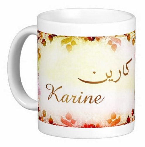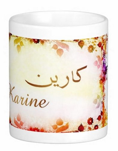 Mug avec le prénom "Karine" écrit en français, en arabe (كارين) et calligraphié de façon artistique en arabe sur la partie droite.
