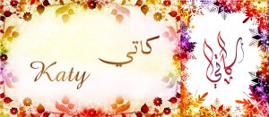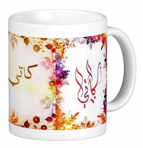 Mug avec le prénom "Katy" écrit en français, en arabe (كاتي) et calligraphié de façon artistique en arabe sur la partie droite.