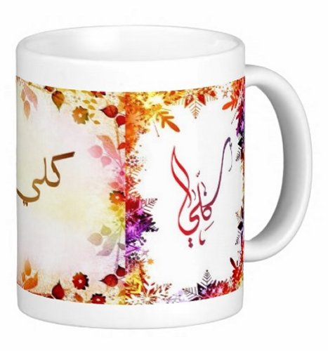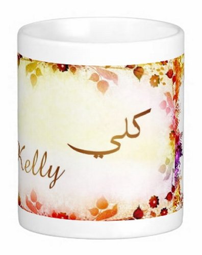 Mug avec le prénom "Kelly" écrit en français, en arabe (كلي) et calligraphié de façon artistique en arabe sur la partie droite.