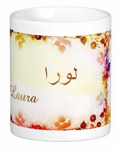 Mug avec le prénom "Laura" écrit en français, en arabe (لورا) et calligraphié de façon artistique en arabe sur la partie droite.