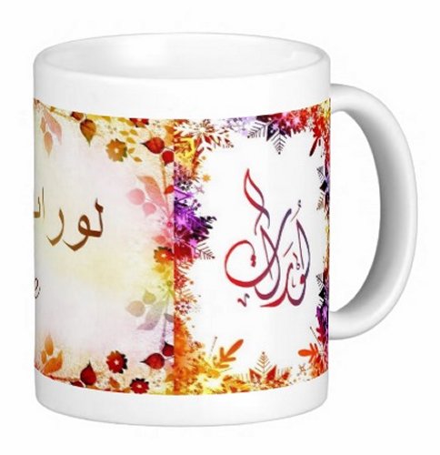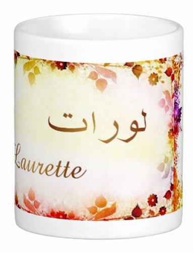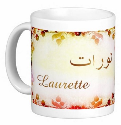 Mug avec le prénom "Laurette" écrit en français, en arabe (لورات) et calligraphié de façon artistique en arabe sur la partie droite.