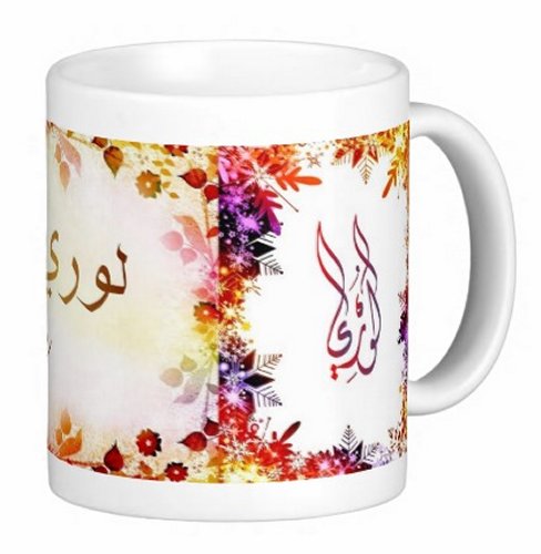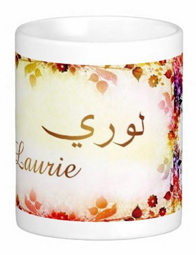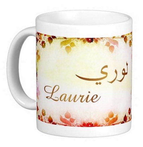 Mug avec le prénom "Laurie" écrit en français, en arabe (لوري) et calligraphié de façon artistique en arabe sur la partie droite.