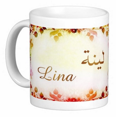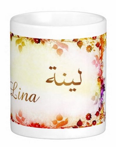 Mug avec le prénom "Lina" écrit en français, en arabe (لينة) et calligraphié de façon artistique en arabe sur la partie droite.