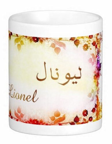 Mug avec le prénom "Lionel" écrit en français, en arabe (ليونال) et calligraphié de façon artistique en arabe sur la partie droite.