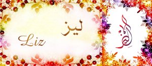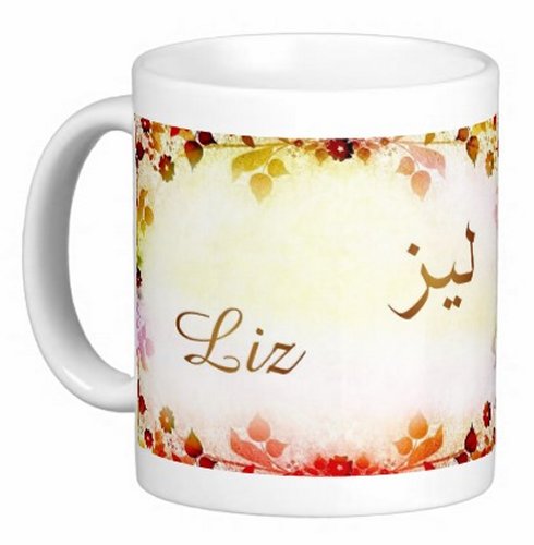 Mug avec le prénom "Liz" écrit en français, en arabe (ليز) et calligraphié de façon artistique en arabe sur la partie droite.