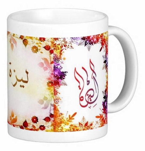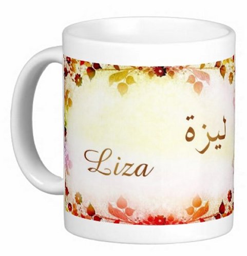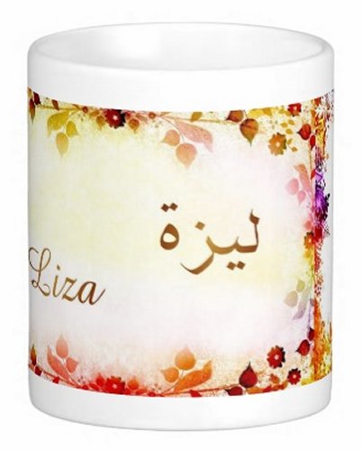 Mug avec le prénom "Liza" écrit en français, en arabe (ليزة) et calligraphié de façon artistique en arabe sur la partie droite.