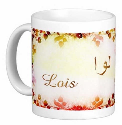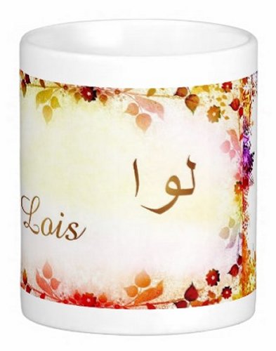 Mug avec le prénom "Lois" écrit en français, en arabe (لوا) et calligraphié de façon artistique en arabe sur la partie droite.