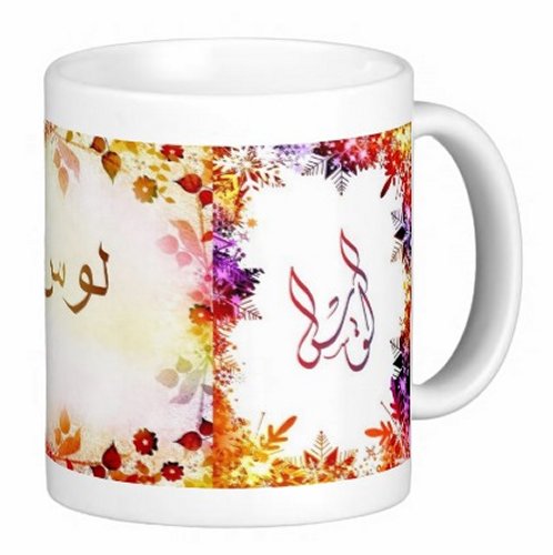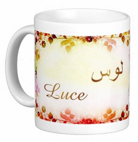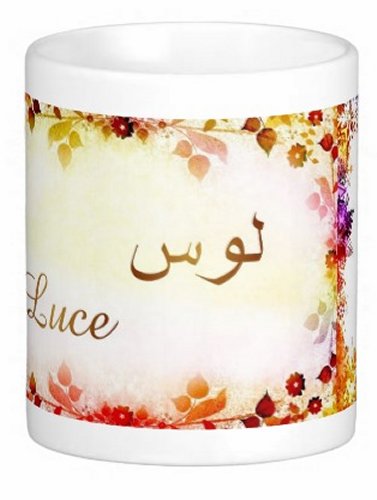 Mug avec le prénom "Luce" écrit en français, en arabe (لوس) et calligraphié de façon artistique en arabe sur la partie droite.