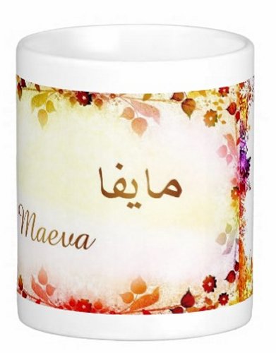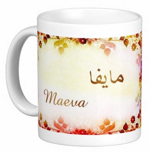Mug avec le prénom "Maeva" écrit en français, en arabe (مايفا) et calligraphié de façon artistique en arabe sur la partie droite.