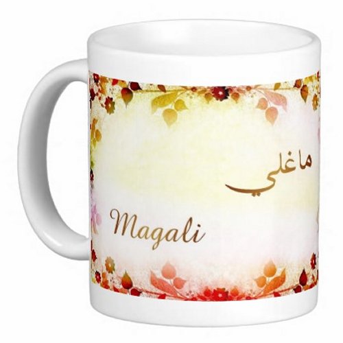 Mug avec le prénom "Magali" écrit en français, en arabe (ماغلي) et calligraphié de façon artistique en arabe sur la partie droite.