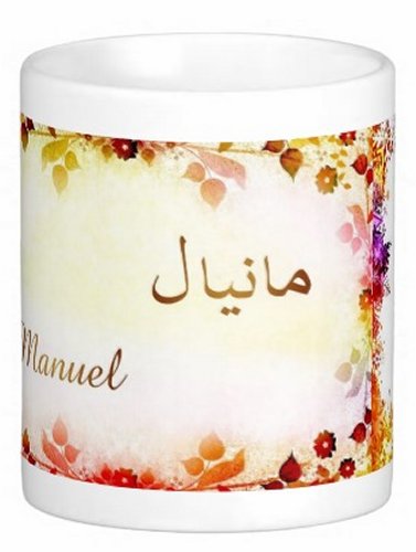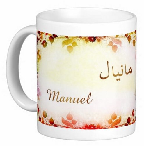 Mug avec le prénom "Manuel" écrit en français, en arabe (مانوال) et calligraphié de façon artistique en arabe sur la partie droite.