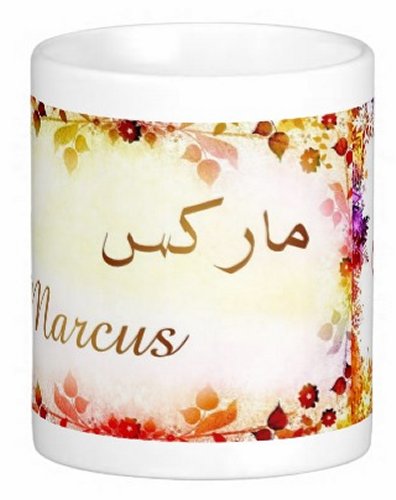 Mug avec le prénom "Marcus" écrit en français, en arabe (ماركس) et calligraphié de façon artistique en arabe sur la partie droite.