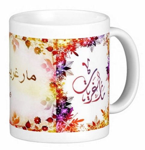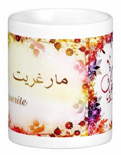 Mug avec le prénom "Marguerite" écrit en français, en arabe (مارغريت) et calligraphié de façon artistique en arabe sur la partie droite.