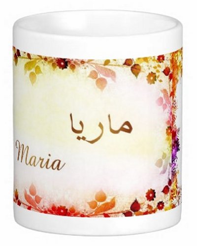 Mug avec le prénom "Maria" écrit en français, en arabe (ماريا) et calligraphié de façon artistique en arabe sur la partie droite.