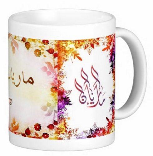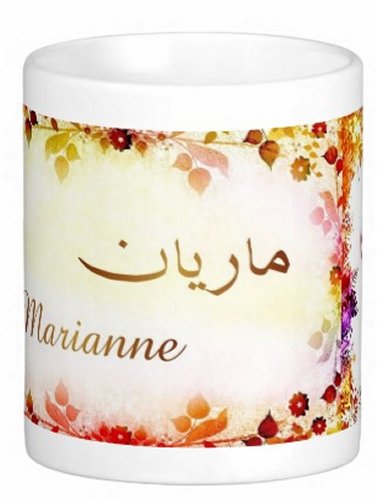 Mug avec le prénom "Marianne" écrit en français, en arabe (ماريان) et calligraphié de façon artistique en arabe sur la partie droite.