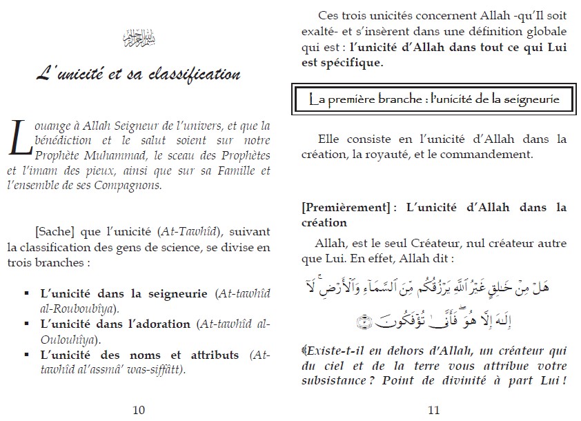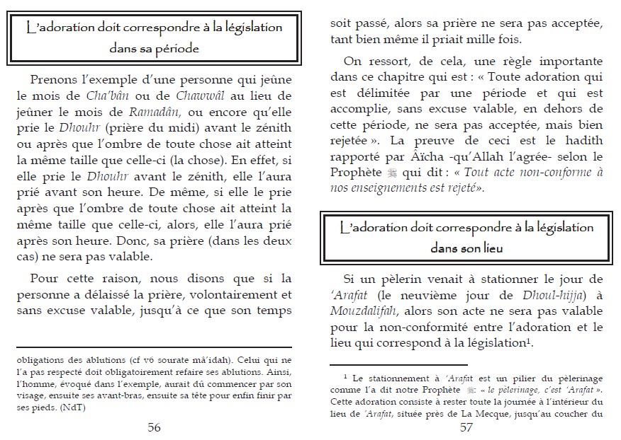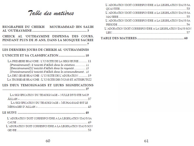 Le cheikh Mouhammad ibn Sâlih Al-‘Outhaymîne -qu’Allah lui fasse miséricorde- montre dans ce livre qu’il faut vouer exclusivement son adoration à Allah.Il explique les différentes sortes d’unicité. Il nous éclaire aussi sur la façon de suivre le Prophète (SAW). Ainsi, ce livre démontre logiquement qu’un acte d’adoration ne sera accepté d’Allah qu’après avoir rempli deux conditions : D’une part la sincérité (Al-Ikhlâs) vis à vis d'Allah le Tout-Puissant et d'autre part la conformité de l’acte d’adoration avec la Sunna du Prophète (SAW) (Al-Moutâba‘a). Un livre à lire absolument…