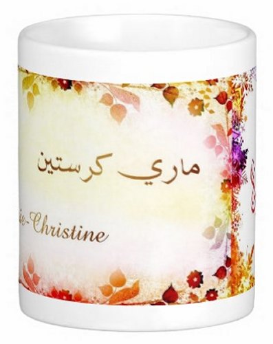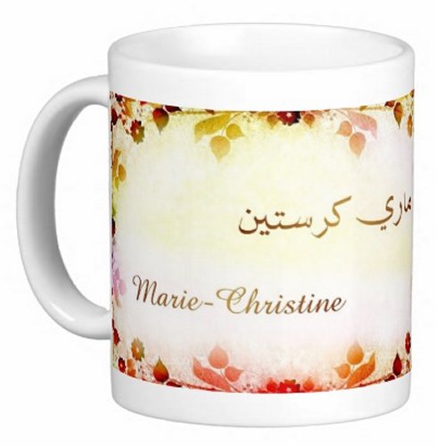 Mug avec le prénom "Marie-Christine" écrit en français, en arabe (ماري كرستين) et calligraphié de façon artistique en arabe sur la partie droite.