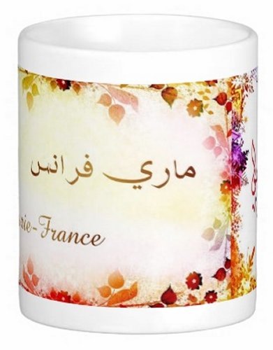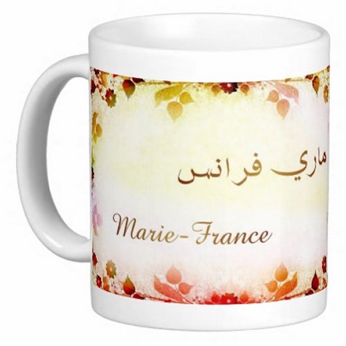 Mug avec le prénom "Marie-France" écrit en français, en arabe (ماري فرانس) et calligraphié de façon artistique en arabe sur la partie droite.