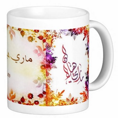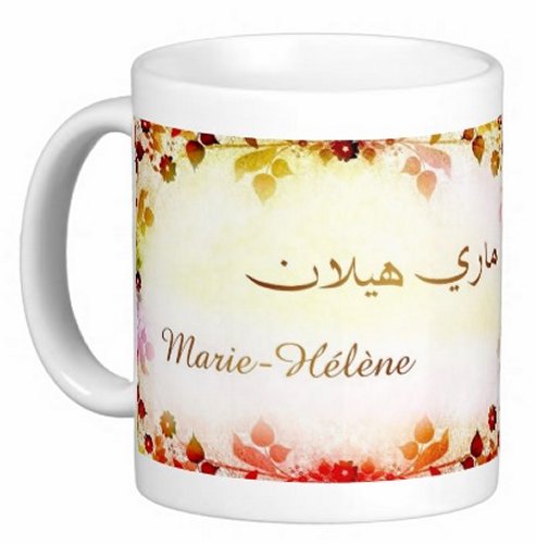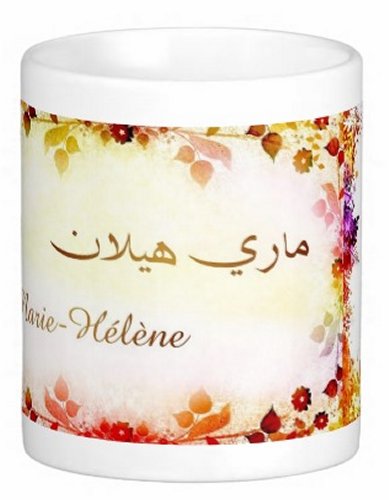 Mug avec le prénom "Marie-Hélène" écrit en français, en arabe (ماري هيلان) et calligraphié de façon artistique en arabe sur la partie droite.