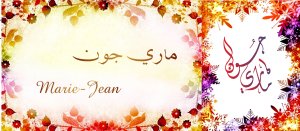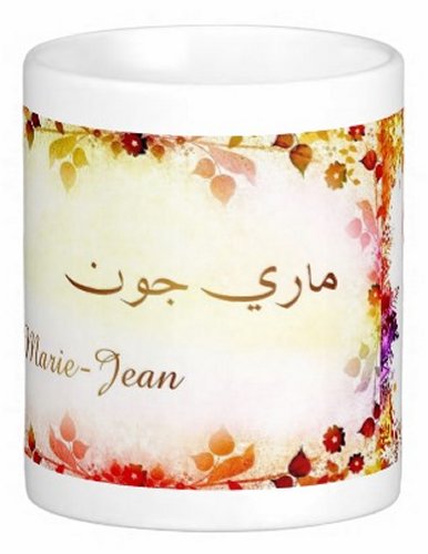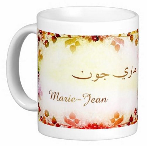 Mug avec le prénom "Marie-Jean" écrit en français, en arabe (ماري جون) et calligraphié de façon artistique en arabe sur la partie droite.