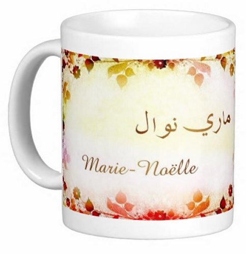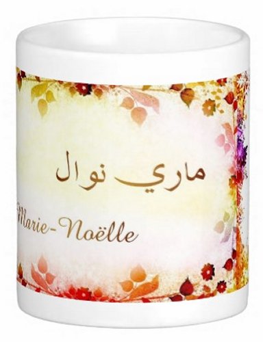 Mug avec le prénom "Marie-Noëlle" écrit en français, en arabe (ماري نوال) et calligraphié de façon artistique en arabe sur la partie droite.