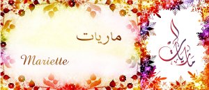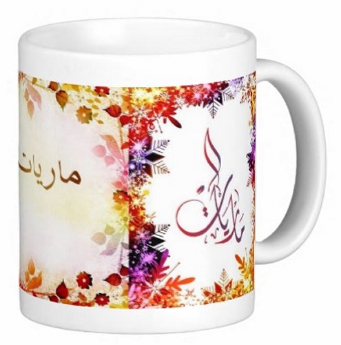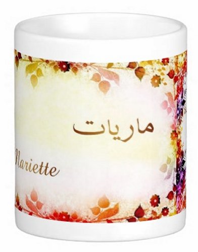 Mug avec le prénom "Mariette" écrit en français, en arabe (ماريات) et calligraphié de façon artistique en arabe sur la partie droite.