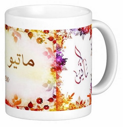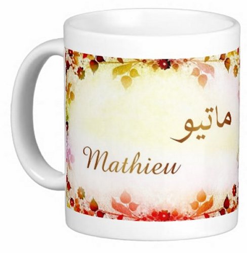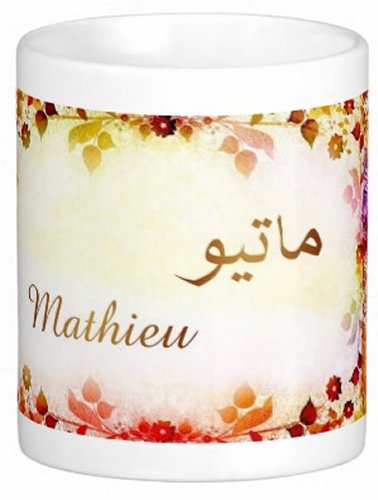 Mug avec le prénom "Mathieu" écrit en français, en arabe (ماتيو) et calligraphié de façon artistique en arabe sur la partie droite.