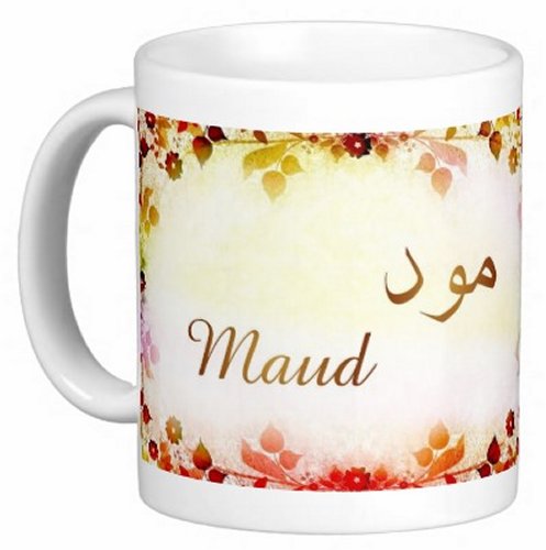Mug avec le prénom "Maud" écrit en français, en arabe (مود) et calligraphié de façon artistique en arabe sur la partie droite.