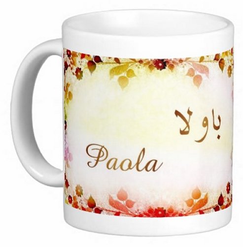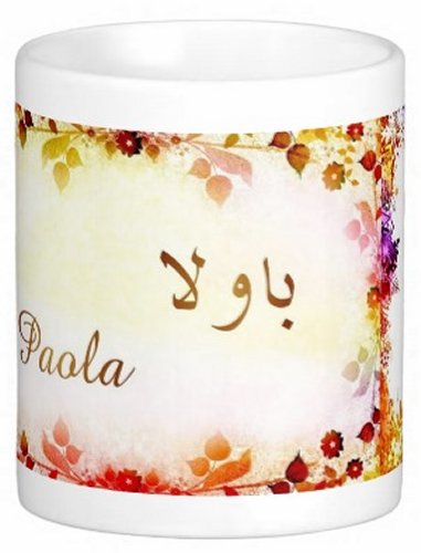 Mug avec le prénom "Paola" écrit en français, en arabe (باولا) et calligraphié de façon artistique en arabe sur la partie droite.